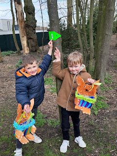 Op een dag lag er een brief in de klas. Deze brief was van de paashaas. Hij vond onze mandjes zo mooi en had daarom eitjes voor ons verstopt. We moesten de groene pijltjes volgen ... zo kwamen we in het bos terecht en begonnen aan onze zoektocht.