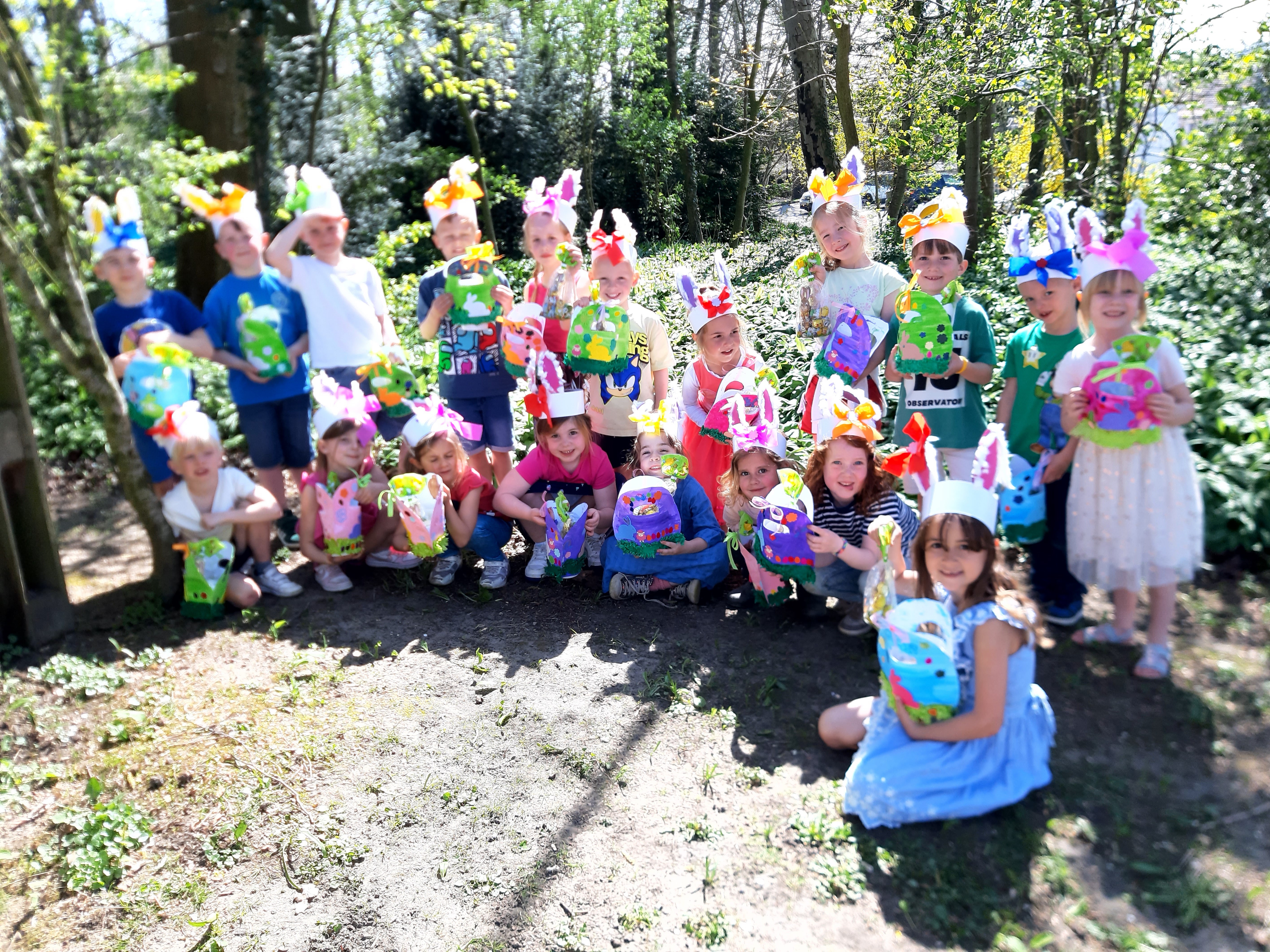 We kregen een brief van de paashaas. Hij had eieren verstopt in het schoolbos en we moesten die gaan zoeken. Eerst moesten we wel nog enkele opdrachtje uitvoeren.